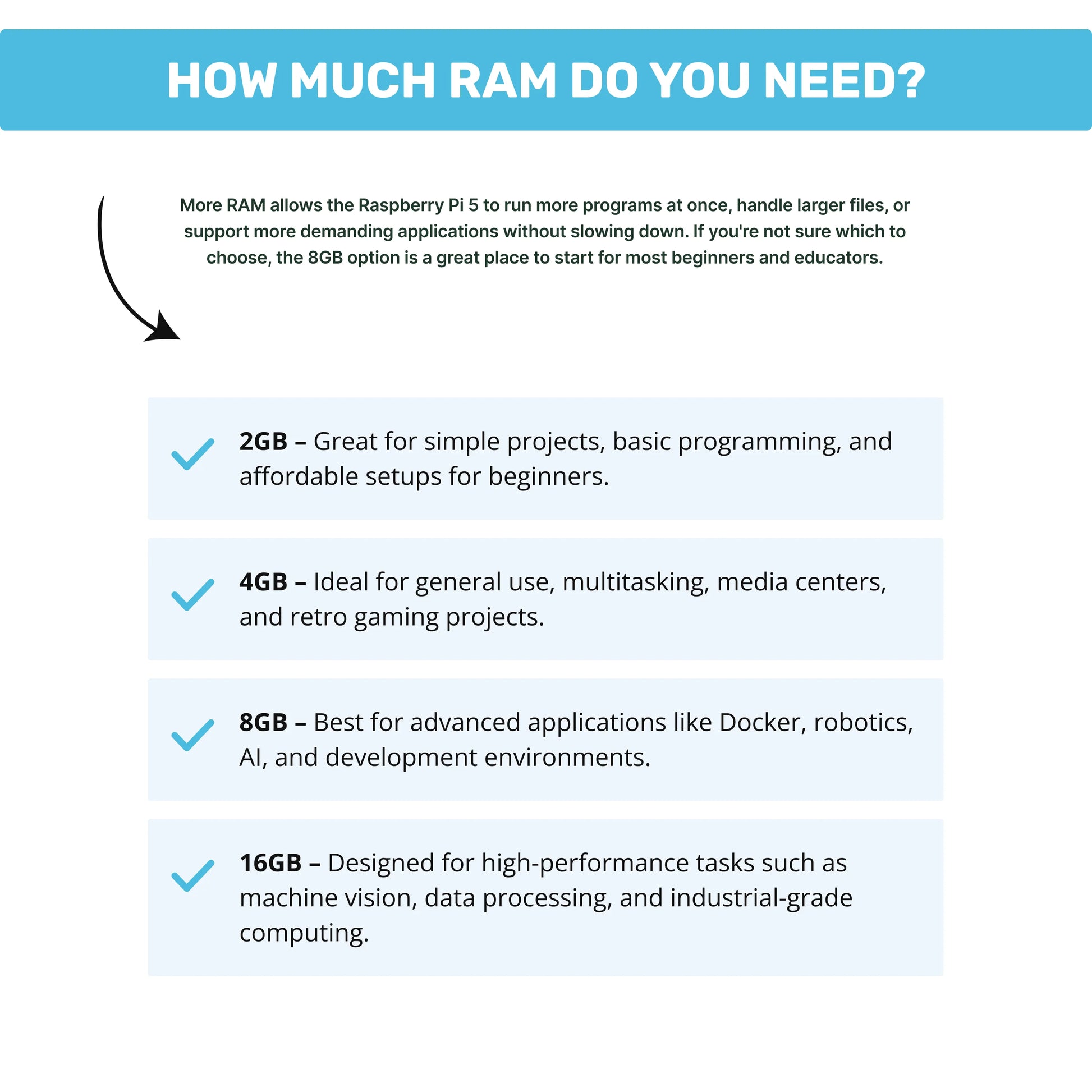- 2GB – Suitable for basic projects, introductory programming, and budget-conscious builds