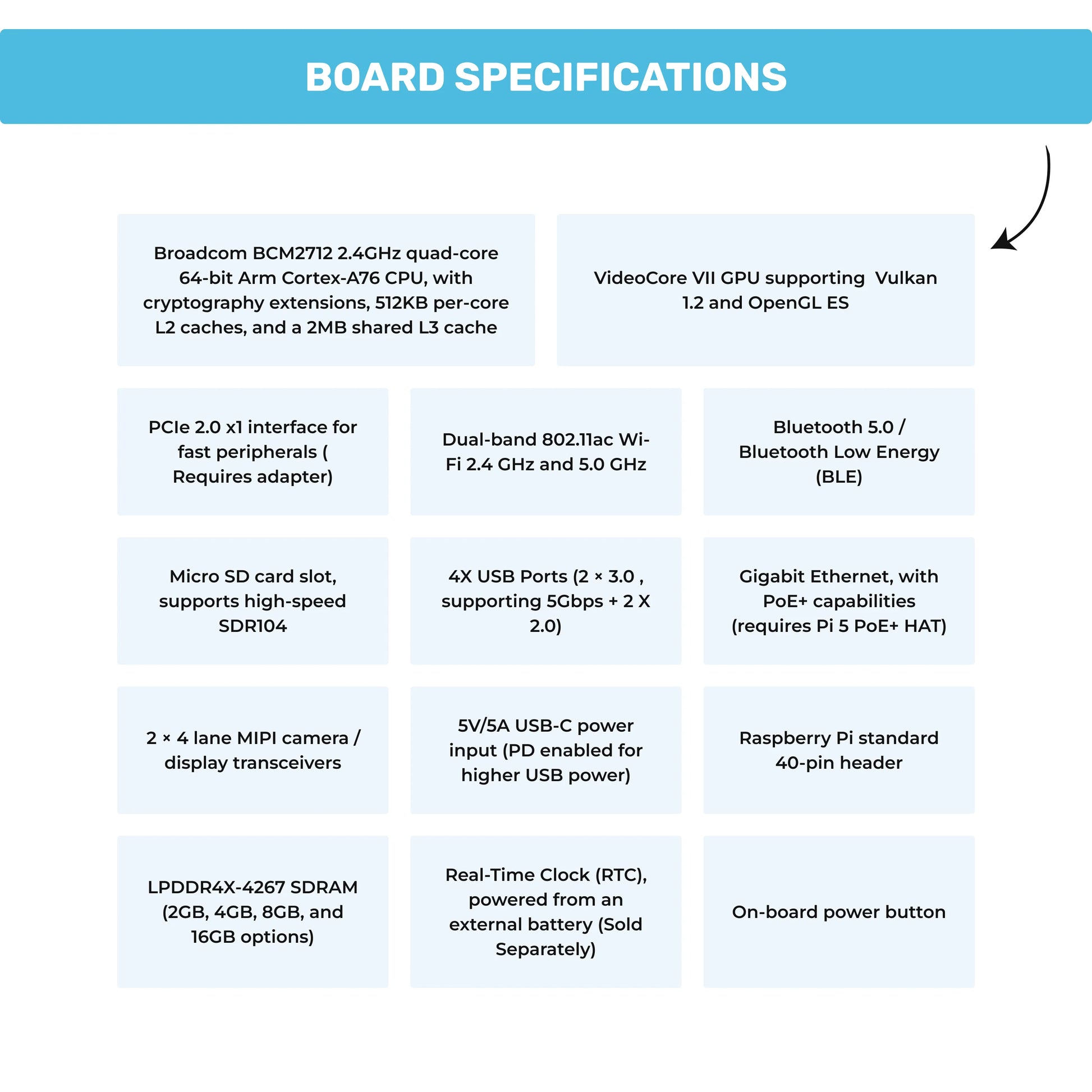 - CPU: Broadcom BCM2712 2.4GHz quad-core 64-bit Arm Cortex-A76 with cryptography extensions, 512KB L2 cache per core, 2MB shared L3 cache